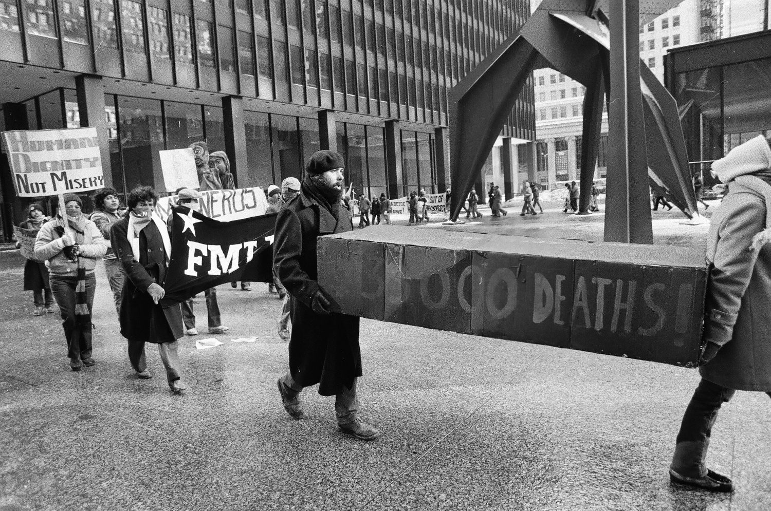 A group of people gather in the Federal Building plaza to protest US aid to El Salvador’s military government during the Salvadoran Civil War, Chicago, February 7, 1982.ST-30002672-0042, Chicago Sun-Times collection, CHM; photograph by Bob Black
