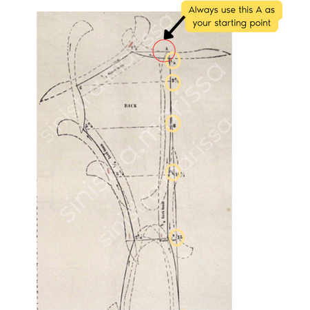 Step 3: Using your French curve and straight edge where necessary, connect the dots of your pattern to match the shape of the original diagram illustration. Your French curve’s largest side always points in the direction specified by the arrows on the original diagram (highlighted in right illustration). This will leave you with a pattern piece properly scaled up to your size, though you may still need to adjust it, so always do a mockup or a tissue fitting first.