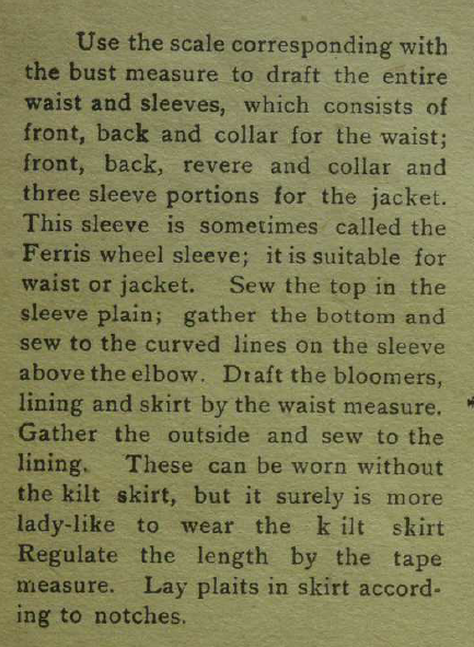 It was the third costume that caught my eye: a gathered skirt, bloomers, and a jacket with enormous sleeve style the book said was “called the Ferris wheel sleeve.” The name was most certainly an attempt to cash in on the hype from the first Ferris wheel’s debut at the 1893 world’s fair. I knew I had to make this costume and see if the sleeve truly lived up to its name!