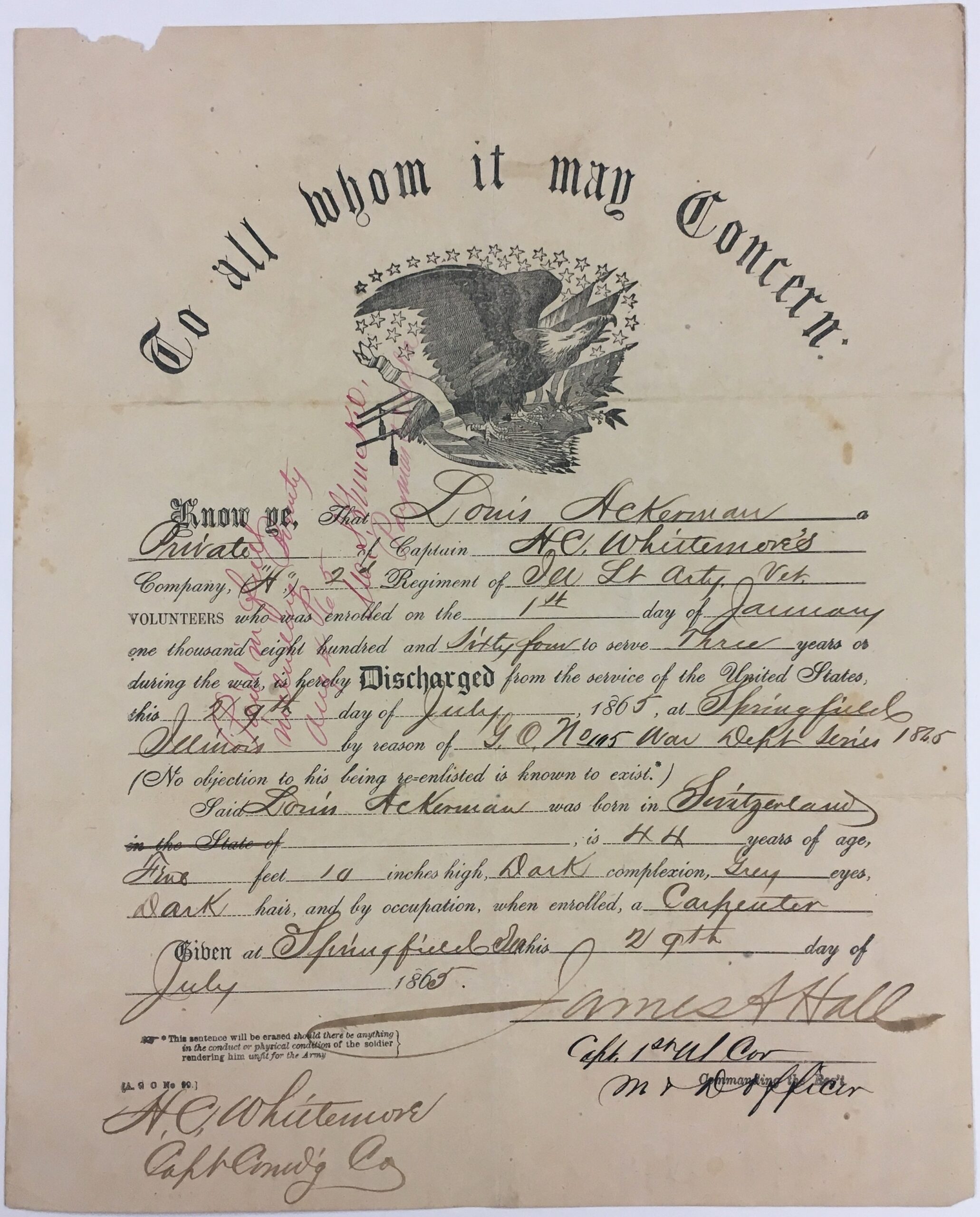 The honorable discharge papers for Louis Ackerman, a Swiss immigrant who lived in Chicago and fought in the Civil War. Louis Ackerman papers