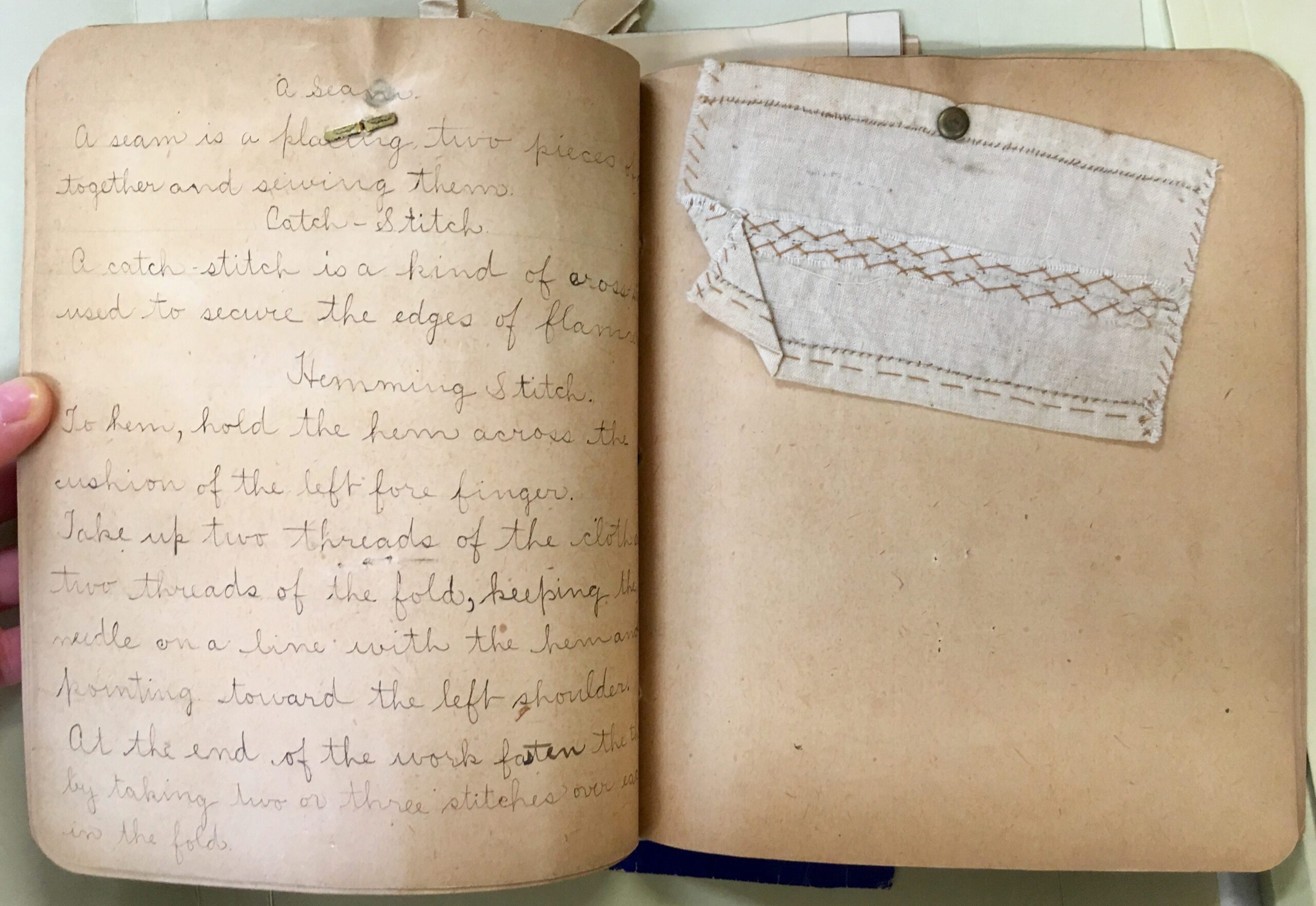 Sewing sample and school workbook of Gertie Maul, early twentieth century. Gertie Maul papers. All images by CHM staff