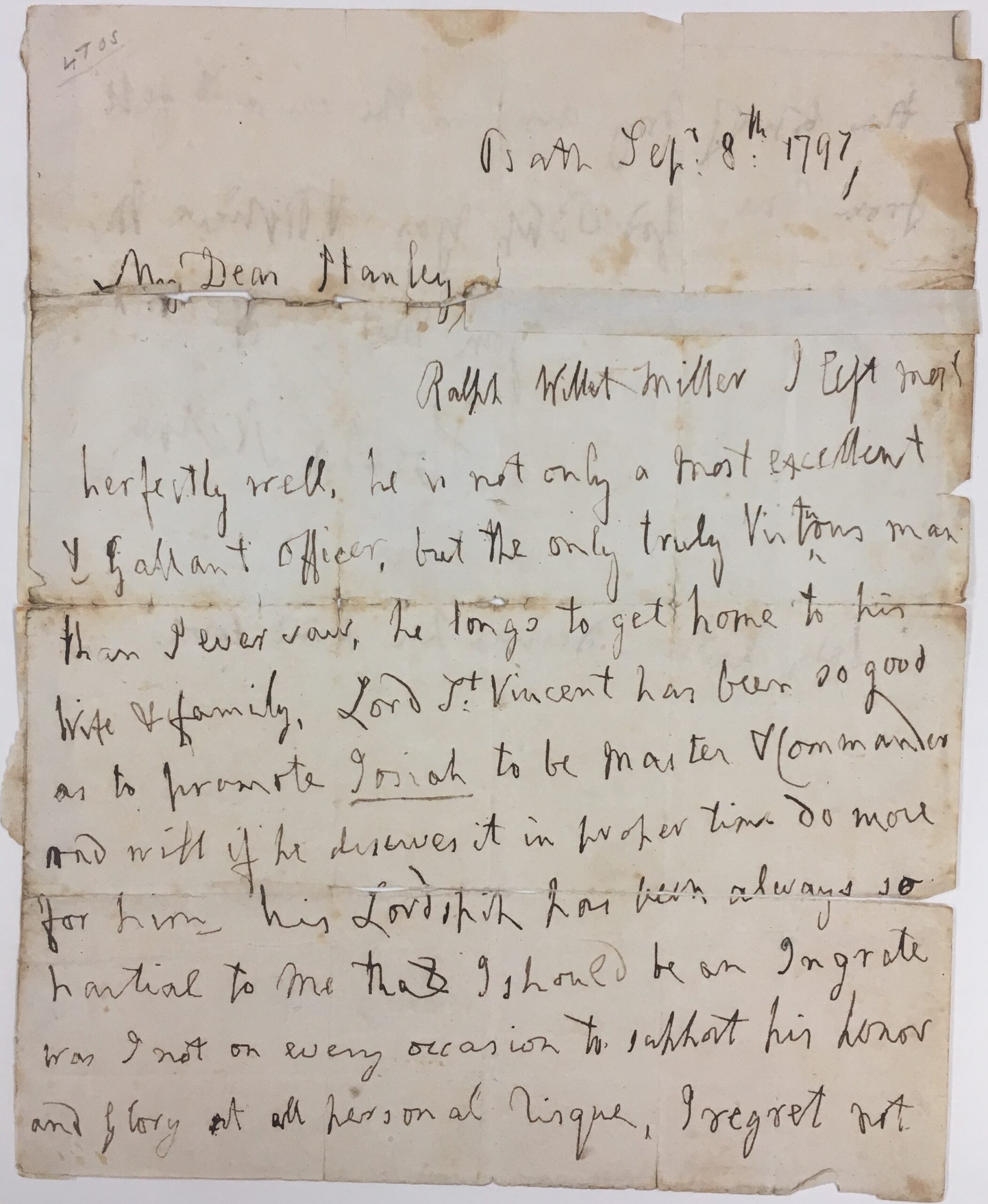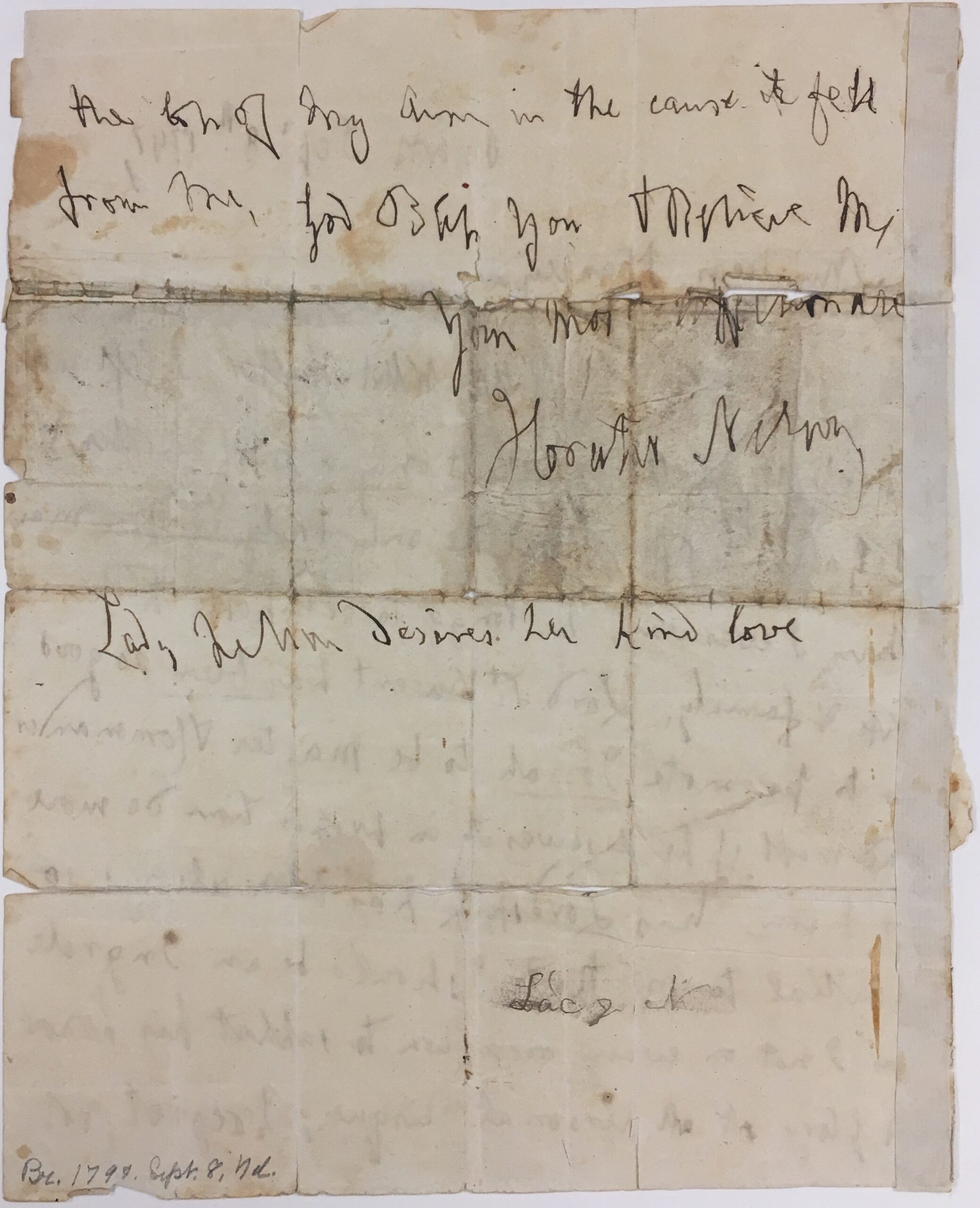 Letter written by Horatio Nelson on September 8, 1797, less than two months after losing his arm at the Battle of Santa Cruz de Tenerife. Horatio Nelson papers