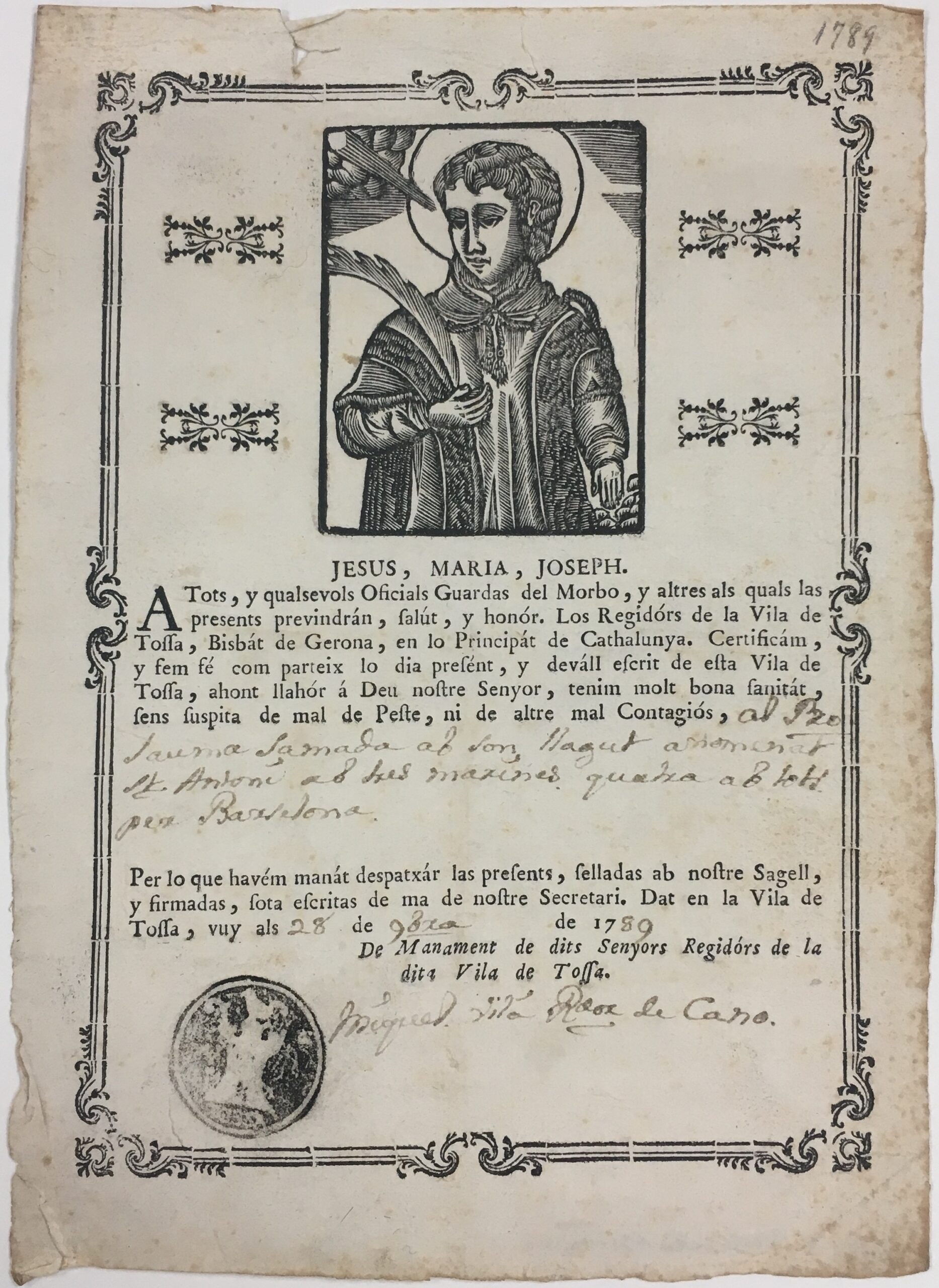 Categorized as a “medical certificate,” this document from Tossa, Catalonia, Spain, in 1789, certifies that the bearer does not have the plague. Medical certificates 1747–1802