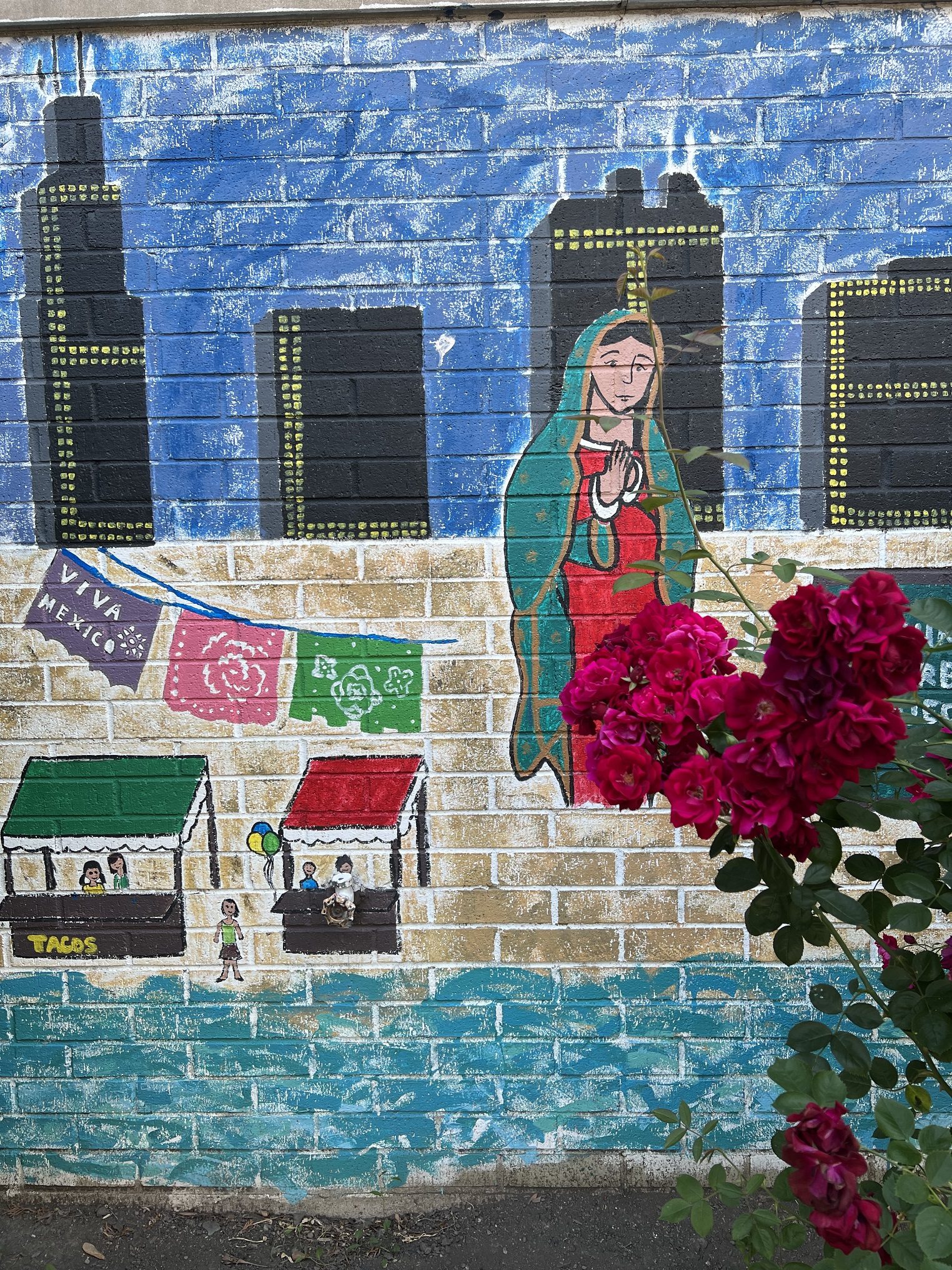 A mural in Chicago’s Back of the Yards neighborhood depicting the Virgin Mary, the city skyline, and two small vendor tents, one of which is selling tacos.