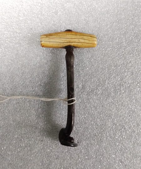 This rudimentary dental tool consists of a curved metal hook attached to a wooden handle.