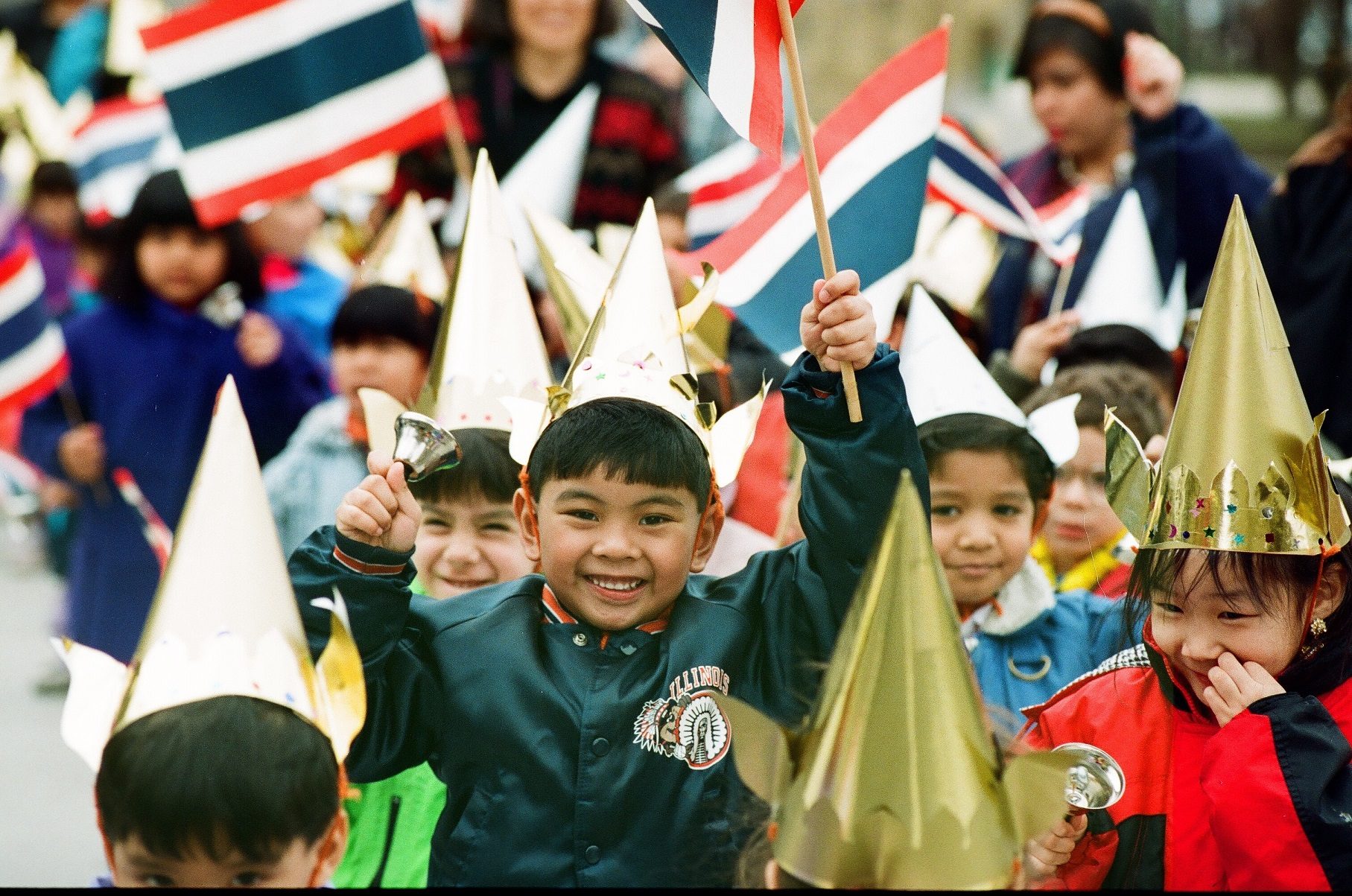 Children march in a parade to celebrate Songkran, the Thai New Year, at the Albany Park Community Center, 5101 N. Kimball Ave., Chicago, April 12, 1993. ST-11002573-0007, Chicago Sun-Times collection, CHM
