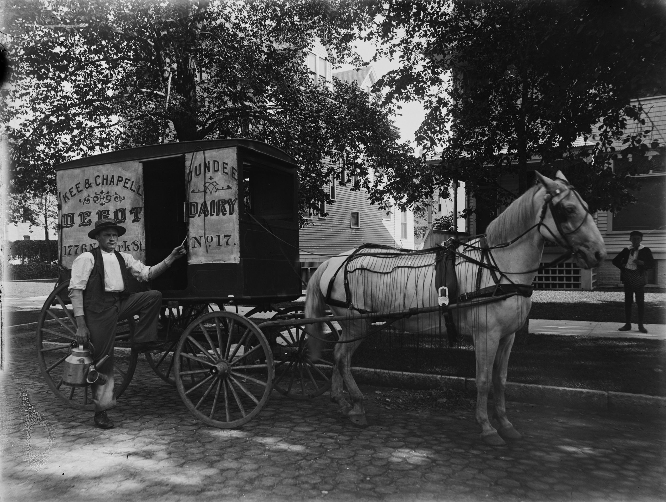 Local processors had to rely on various forms of transportation to bring milk from farms and to distribute it to its consumers. Kee & Chapell Depot/Dundee Dairy horse-pulled cart, Chicago, c. 1895, The business was located at 1776 N. Clark Street. CHM, ICHi-072655