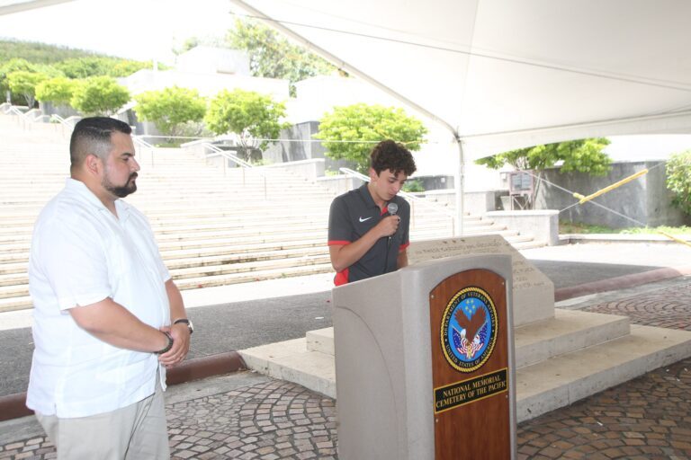 Joshua Mendez (right) and Josue Contreras (left) reading PFC Felipe Sanchez’s eulogy at the National Memorial Cemetery of the Pacific, Honolulu, Hawai‘i, June 25, 2023. Photograph by Westin Saito, Education and Interpretation Research Coordinator at Pacific Historic Parks
