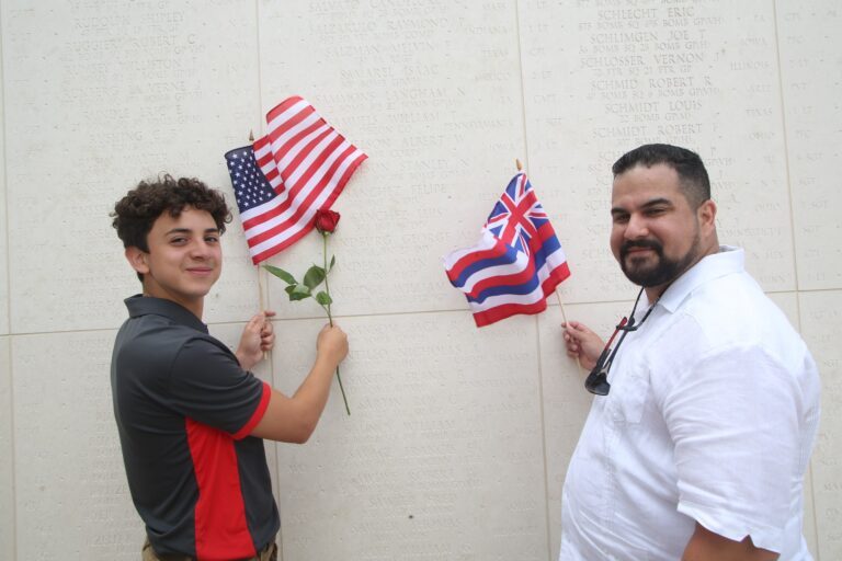 Joshua Mendez (left) and Josue Contreras (right) at PFC Felipe Sanchez’s memorial at the National Memorial Cemetery of the Pacific, Honolulu, Hawai‘i, June 25, 2023. Photograph by Westin Saito, Education and Interpretation Research Coordinator at Pacific Historic Parks