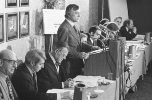 Representatives of the BPPPI hold a press conference regarding the Red Squad at the Executive House Hotel, 71 East Wacker Drive, Chicago, January 5, 1977. Dr. Marvin Rosner is speaking at the podium, and Albert E. Jenner Jr. sits to the left of the podium. ST-60002106-0062, Chicago Sun-Times collection, CHM