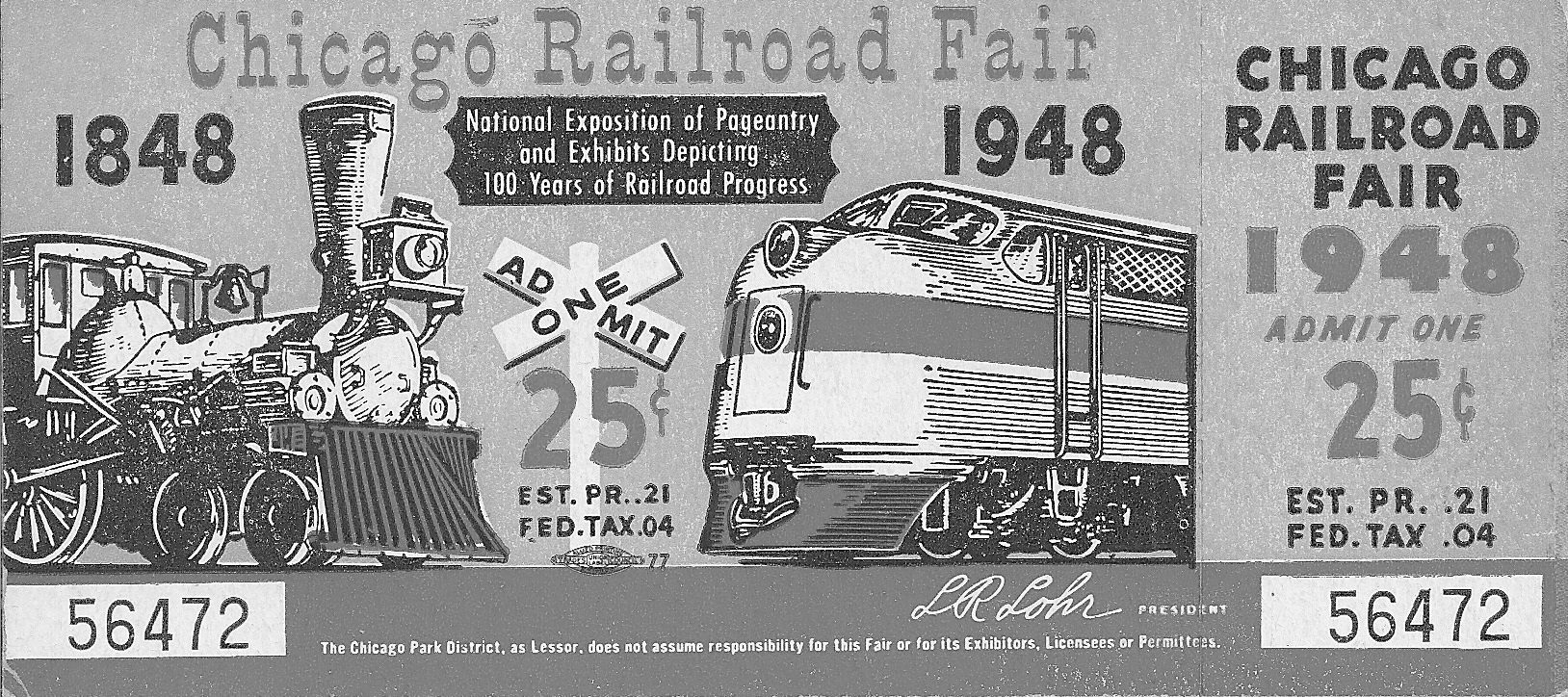 An admission ticket to the 1948 Chicago Railroad Fair. According to the US Bureau of Labor Statistics inflation calculator, 25¢ in 1948 is equivalent to $3.15 in 2023. Courtesy of Joseph M. Di Cola.
