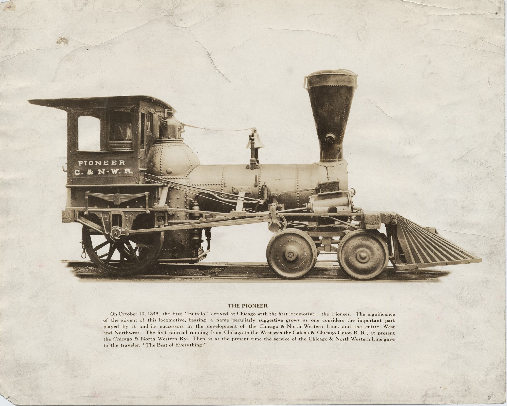 An undated photograph of the Pioneer. The first sentence of the caption reads: “On October 10, 1848, the brig ‘Buffalo’ arrived at Chicago with the first locomotive—the Pioneer.” CHM, ICHi-037010