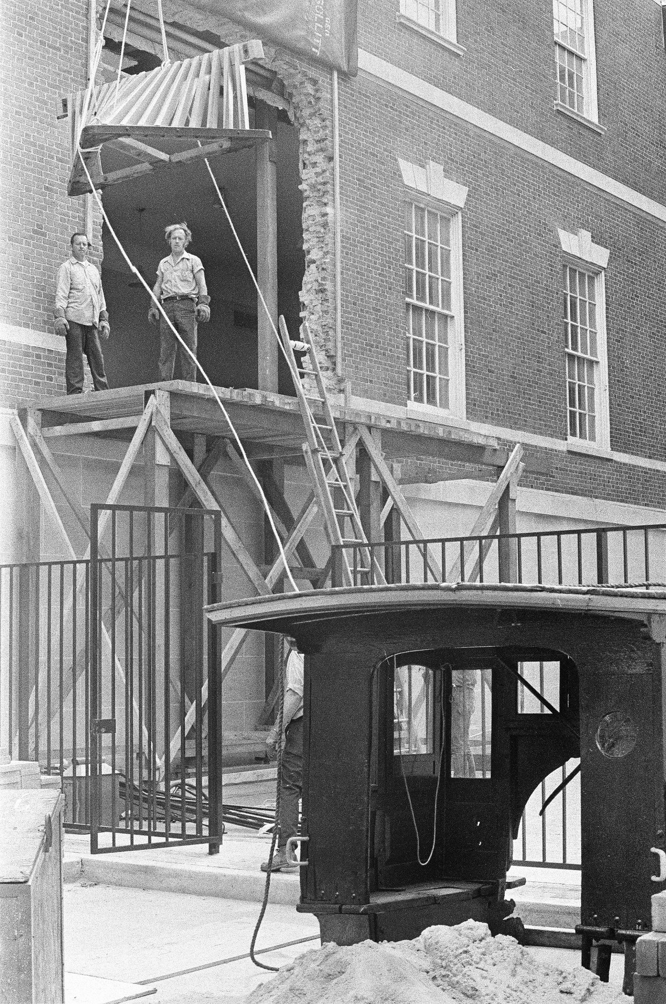 The cowcatcher of the Pioneer being lifted into the Chicago Historical Society (Chicago History Museum), August 15, 1972. ST-19031875-0010, Chicago Sun-Times collection, CHM
