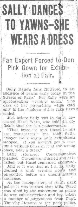 2. “Sally Dances in Loop; Arrest Her 4 Times.” Chicago Daily Tribune (1923-1963),  August 5, 1933. https://www.proquest.com/historical-newspapers/sally-dances-loop-arrest-her-4-times/docview/181401483/se-2
