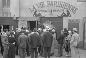 A crowd listens to a barker on a small stage in the Streets of Paris at the A Century of Progress International Exposition, Chicago, September 1934. CHM, ICHi-167341; O. L. Cook, photographer