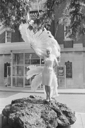 Sally Rand stands atop the Great Chicago Fire relic at the Chicago Historical Society, August 30, 1966. ST-90004010-0033, Chicago Sun-Times collection, CHM
