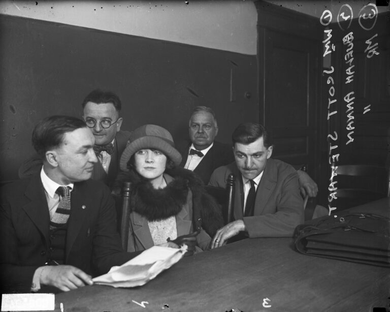 Beulah Annan and her husband, Al (right), sitting with her attorney, William Scott Stewart (left) and two unidentified men, Chicago, c. April 1924. DN-0076803, Chicago Daily News collection, CHM