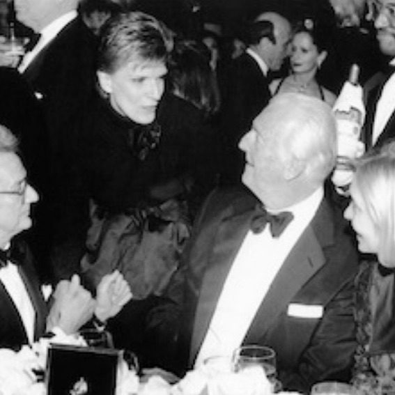 Victor (left) looks on as Nena Ivon (standing) speaks with Givenchy and Bonnie Deutsch, a past Costume Council president, at the 1995 Donors’ Ball.