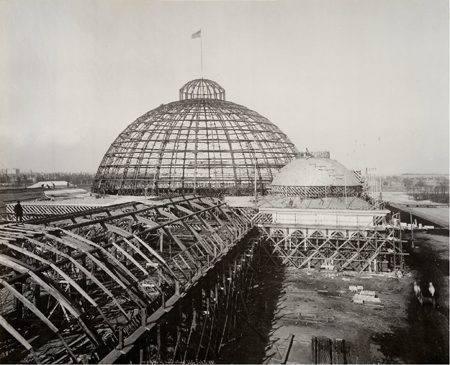 Top: The Horticultural Building under construction, Chicago, February 1892. Photograph by C. D. Arnold. CHM, ICHi-059982 Bottom: The completed Horticultural Building, Chicago, 1893. Photograph by William Henry Jackson. CHM, ICHi-017127